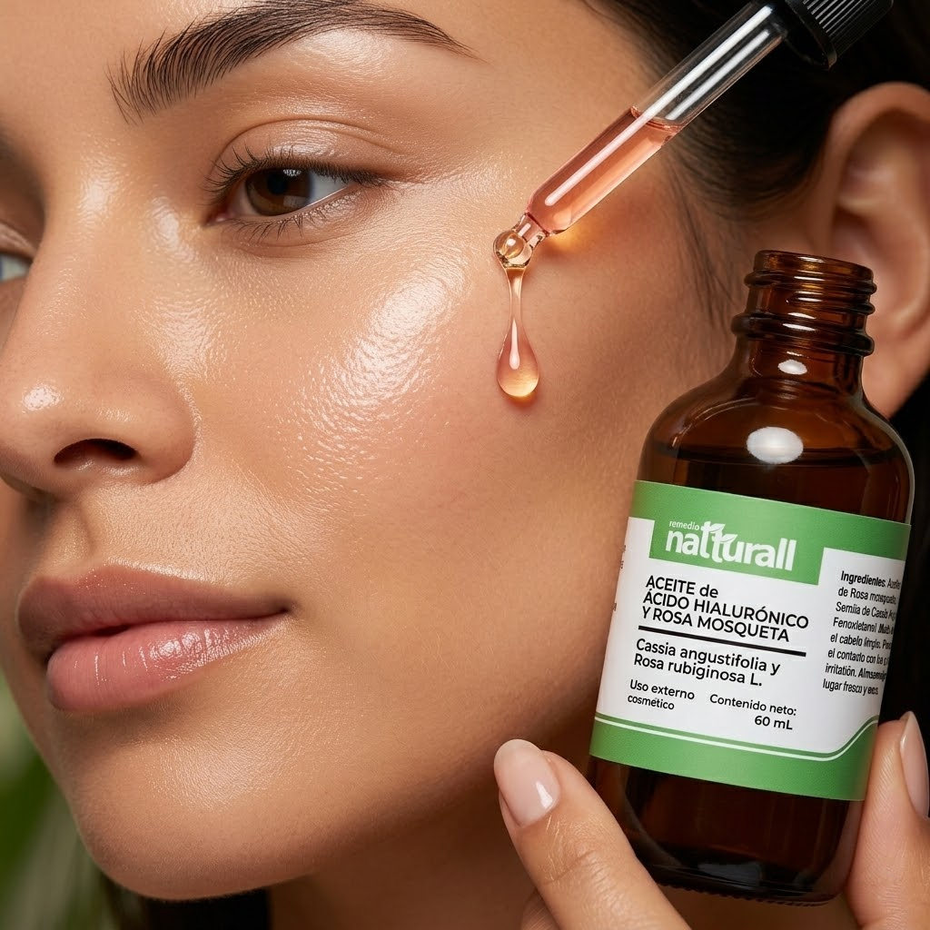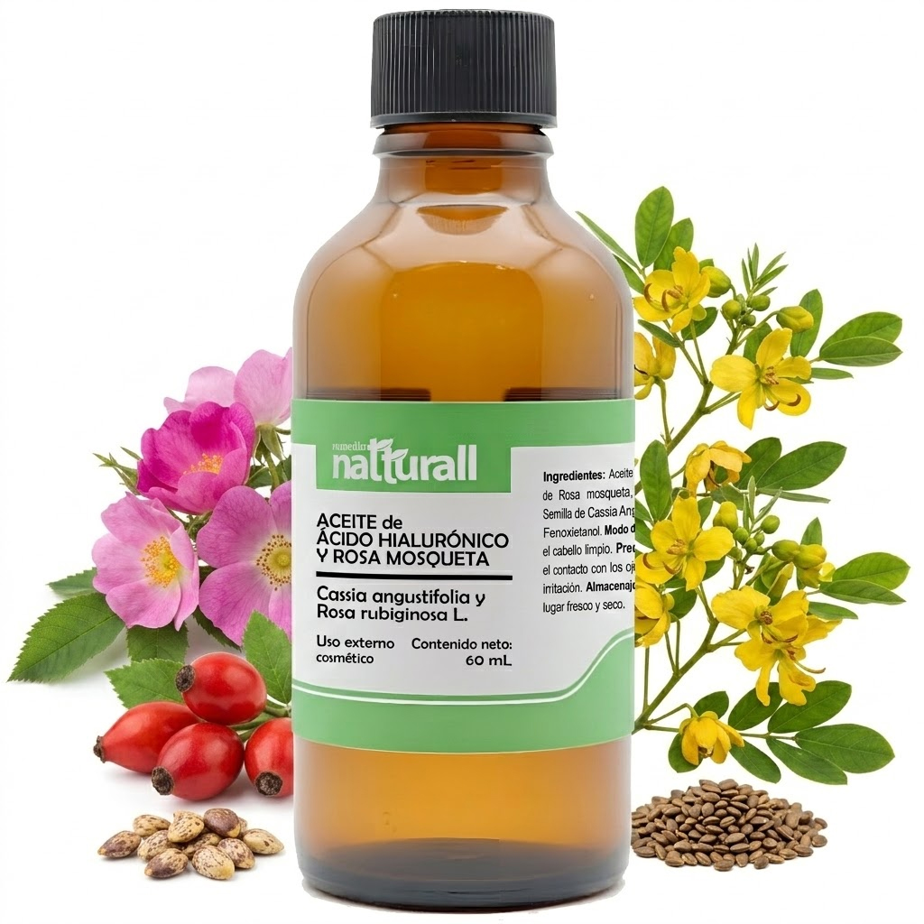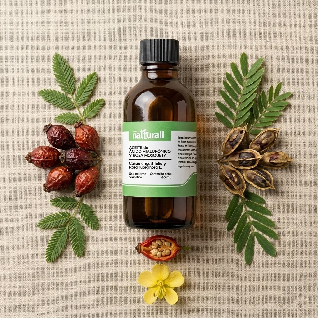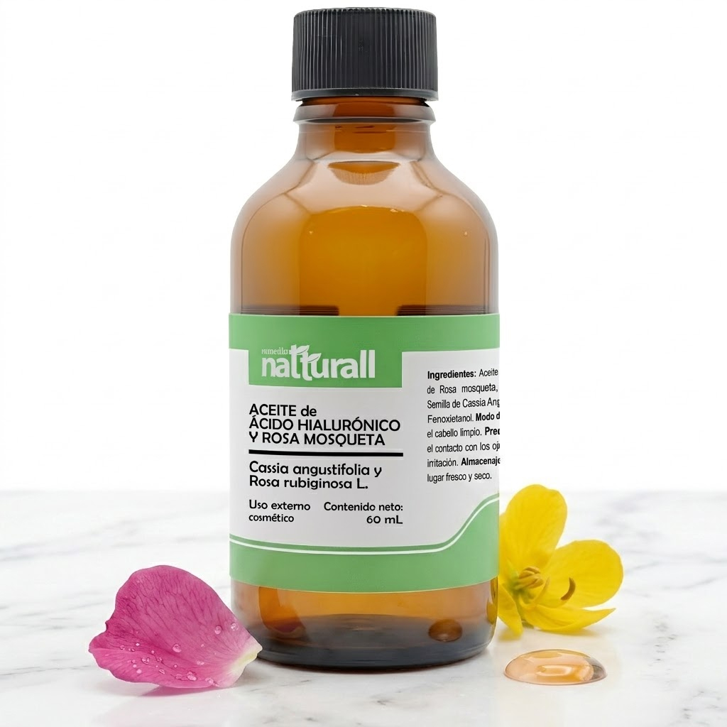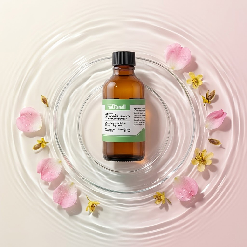 • El Aceite de Ácido Hialurónico (extracto de Cassia Angustifolia) y Rosa Mosqueta de Natturall es un abrazo de hidratación que envuelve tu rostro en una textura ligera y sedosa.