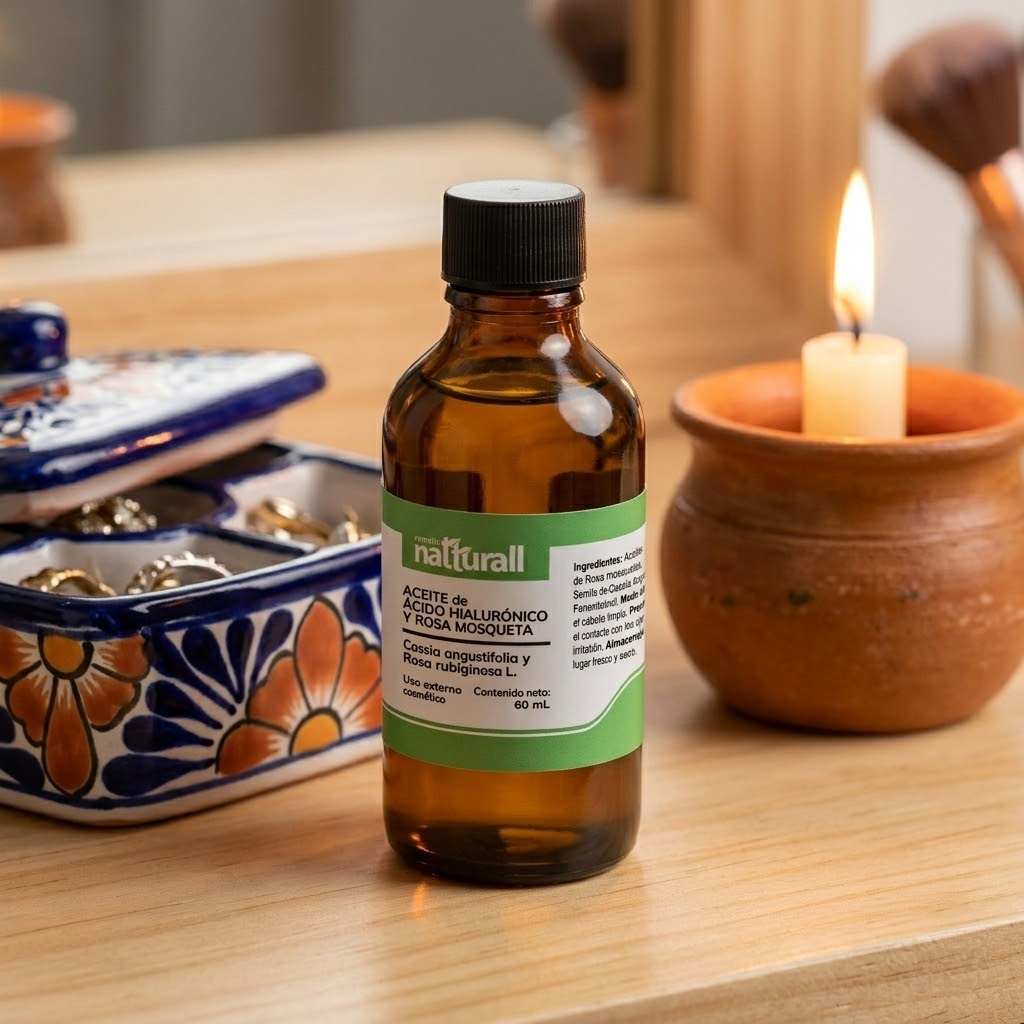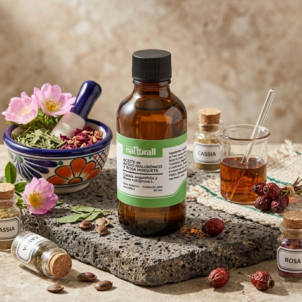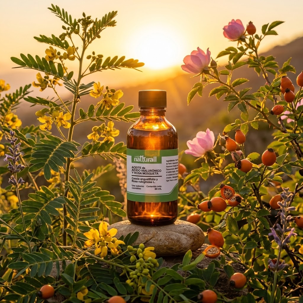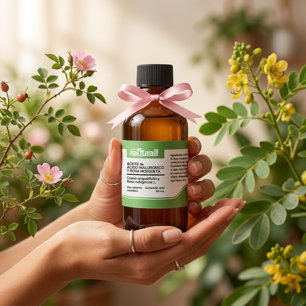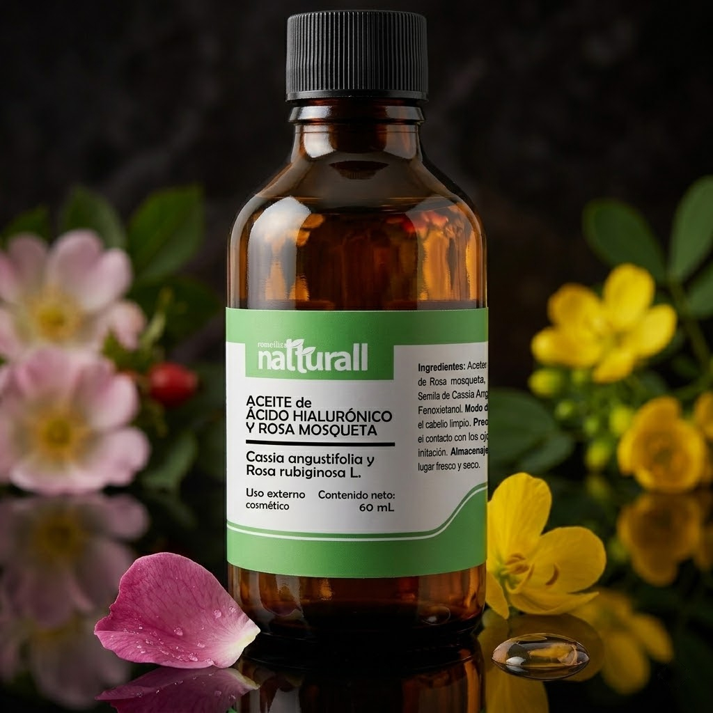 • El Aceite de Ácido Hialurónico (extracto de Cassia Angustifolia) y Rosa Mosqueta de Natturall es un abrazo de hidratación que envuelve tu rostro en una textura ligera y sedosa.